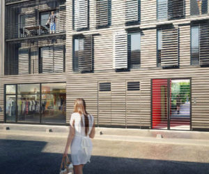 - Solutions constructives : Ossature bois sur 6 niveaux (R+5) Doubles murs en refends pour les logements (solution acoustique) – Plancher à double solivage – Bardage à clins M2 et M3 en bois massif pré-grisaillé (mélèze et douglas) – Cage d’ascenseur en CLT – menuiseries bois triple vitrage.